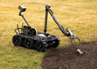 Centaur is a remotely operated, medium-sized UGV system that provides a standoff capability to detect, confirm, identify, and dispose of hazards. Weighing roughly 160 pounds, the open-architected robot features an advanced EO/IR camera suite, a manipulator arm that reaches more than six feet, and the ability to climb stairs. Its modular payloads can be used for CBRNE detection and other missions.