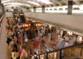 Riders at rush hour at the Farragut North Metrorail station on the Red Line. Credit: WMATA Photograph by Larry Levine